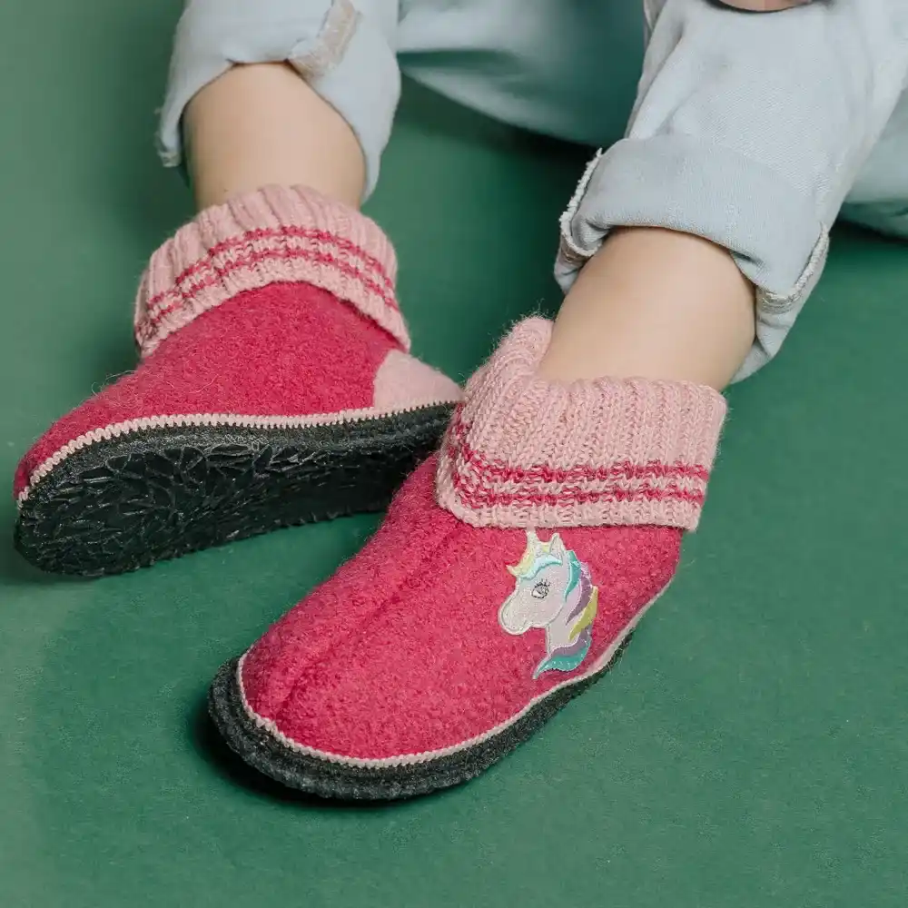 Hüttenschuh aus kuscheliger Wolle mit einem Einhorn-Motiv für Mädchen. Das Obermaterial besteht aus kuscheliger Bio Schafwolle und hält die Füße deines Kindes trocken und warm. Ein Rippbündchen umschließt den Knöchel und sorgt zusätzlich für guten Halt am Kinderfuß. Die patentierte naturub® Naturkatschuksohle ist rutschfest und gibt natürlichen Halt bei jedem Schritt. Der Walkstoff für diesen süßen Hüttenschuh wird in unserer Manufaktur in Tirol hergestellt.